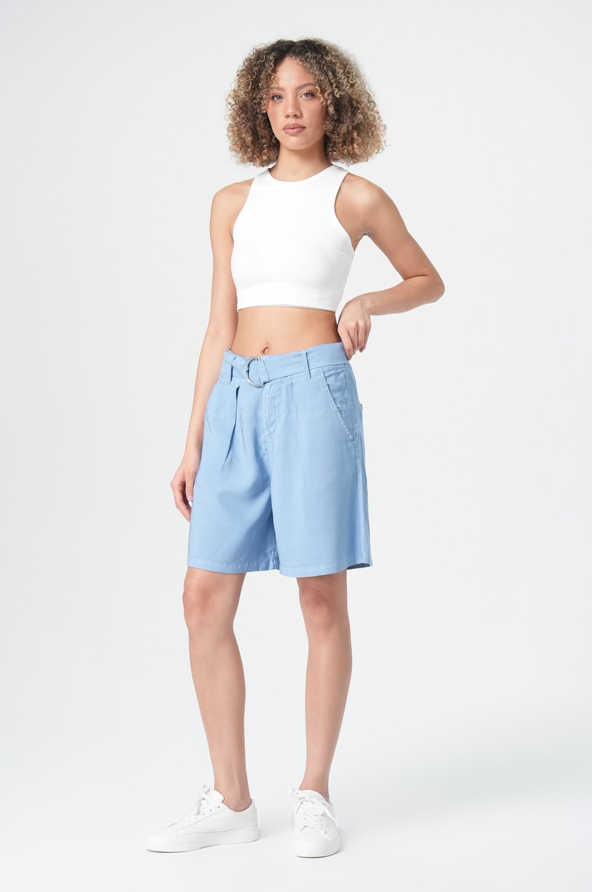 Die Nice Damen Jeans Shorts in luftigem Denim Blau präsentieren sich als perfekter Sommerbegleiter mit stilvollem Flair. Der hochwertige Materialmix aus 97% Baumwolle und 3% Elastan sorgt für angenehme Bewegungsfreiheit und einen perfekten Sitz. Die helle, sommerliche Hellblau-Nuance strahlt Leichtigkeit aus und lässt sich vielseitig kombinieren. Besonders auffällig ist der moderne D-Ring Gürtel in der gleichen Stoffqualität, der den High-Waist-Schnitt gekonnt betont und dem Look eine modische Note verleiht. Die lockere Passform mit angesagten Bundfalten schmeichelt der Silhouette und sorgt für optimalen Tragekomfort bei sommerlichen Temperaturen.Eleganz und Wohlgefühl an heißen Tagen