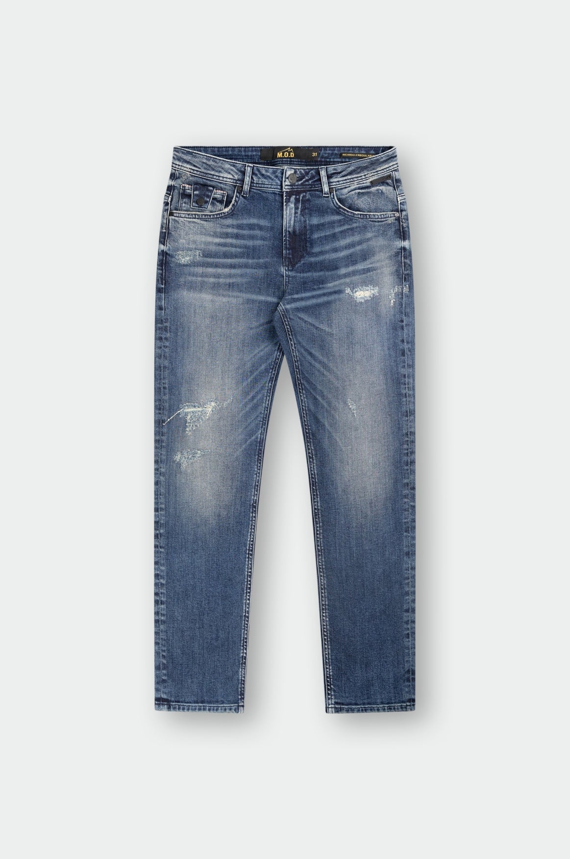 Die “Ricardo Regular” von M.O.D ist ein lässiger Denim im Regular Fit, der durch die Destroyed-Effekte einen coolen, used Look erhält. Der bequeme Schnitt sorgt für Komfort, während die sichtbaren Abriebstellen der Hose eine trendige, urbane Note verleihen. Diese Hose passt perfekt zu einem entspannten Casual-Look und ist ideal für jeden, der es gerne etwas lässiger und modisch auffällig mag.
