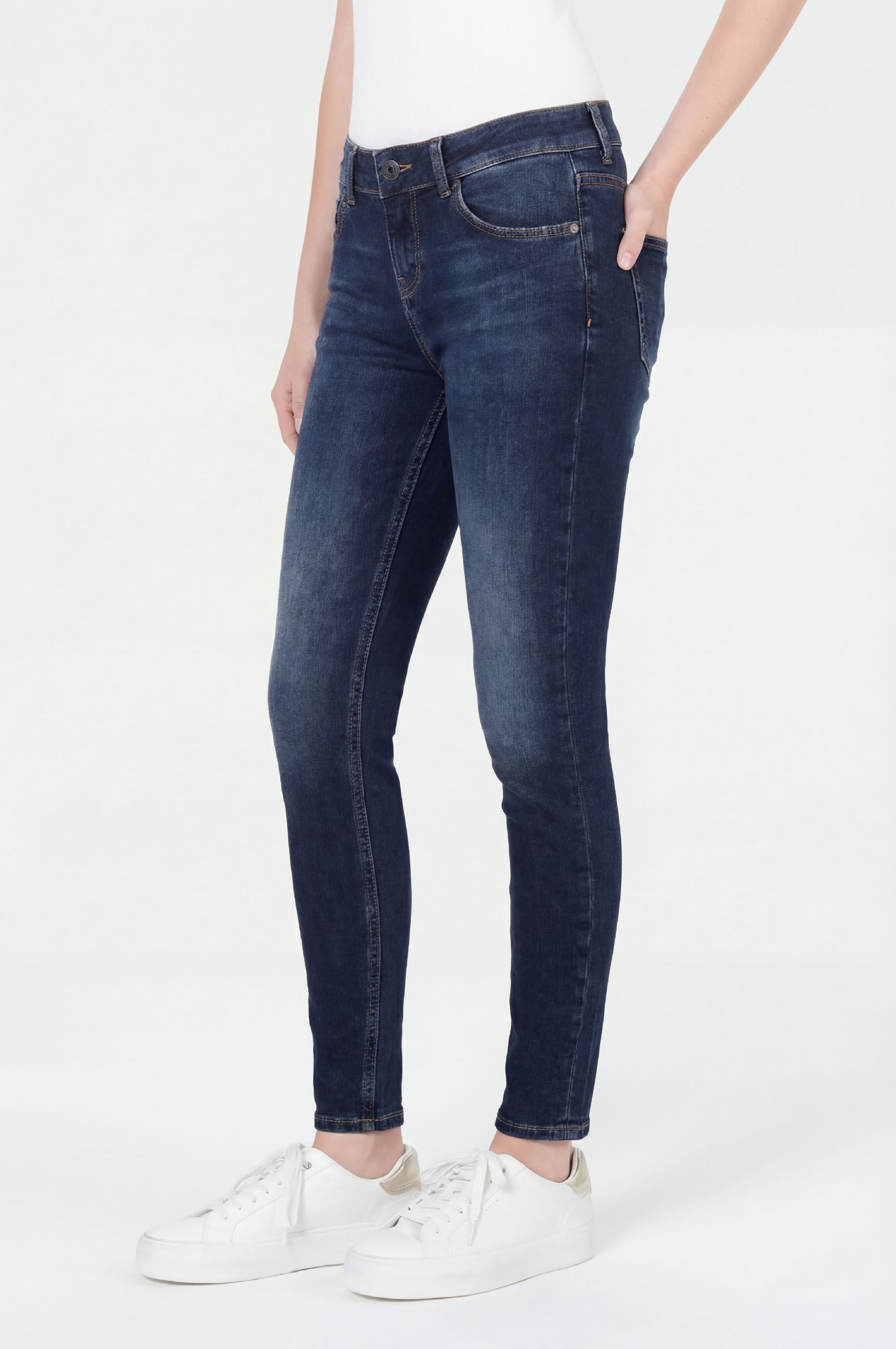Die Sina Skinny Fit Jeans in Maxwell Blau vereint moderne Silhouette mit raffinierter Leichtigkeit. Ihre präzise Passform betont deine natürlichen Konturen auf schmeichelnde Weise und schafft eine elegante, elongierte Linie. Der sorgfältig abgestimmte Materialmix aus 80 % Baumwolle, 17 % Polyester und 3 % Elasthan sorgt für angenehme Geschmeidigkeit bei optimaler Formstabilität. Die knöchellange Silhouette und die dunkle Maxwell Blau mit ihren hellen Wasch-Effekten verleihen dieser Jeans eine besondere Frische, die deinen Looks eine luftige Eleganz schenkt.Stilvolle Vielseitigkeit für jeden Anlass